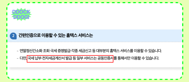 간편 인증서가 있으면 대부분의 홈택스 업무를 볼 수 있지만, 국세 납부/ 전자세금계산서 발급 등의 일부 서비스에는 공동인증서가 필요한 점 알아두시면 좋을 것 같습니다.