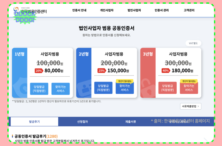 한국범용인증센터 홈페이지에서도 법인 공동인증서를 발급받을 수 있습니다. 요금제도 은행보다 저렴하고, 년수가 늘어날 수록 할인도 높아집니다.
