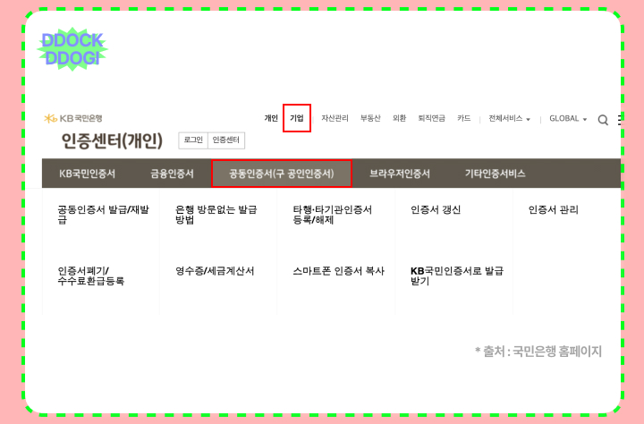 국민은행 법인계좌가 있는 분들은 [기업 > 동인증서 발급]에서 해주셔도 됩니다. (타 은행도 동일)