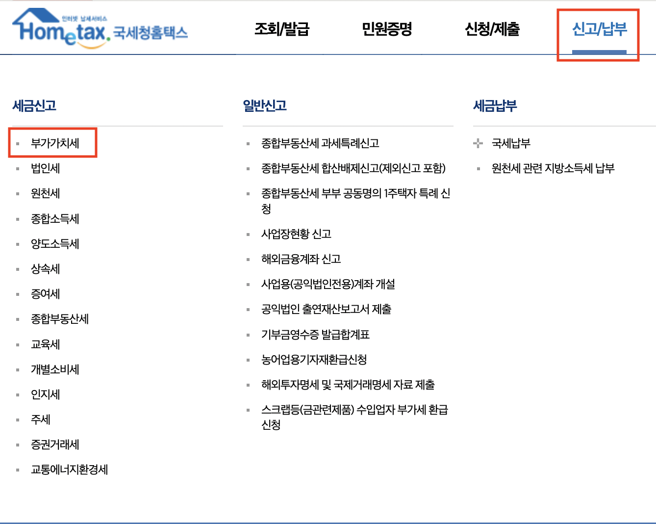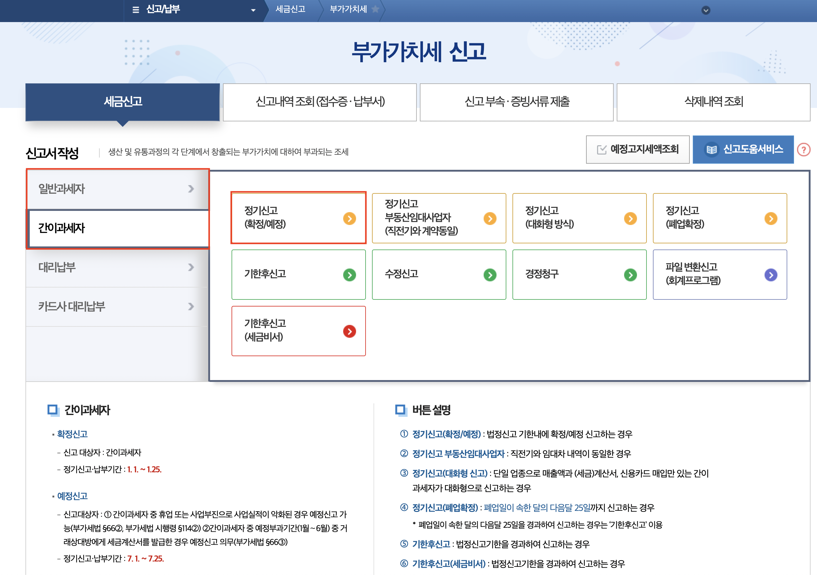 ► 신고 > 부가가치세를 클릭하면 아래와 같은 화면이 나오는데요.