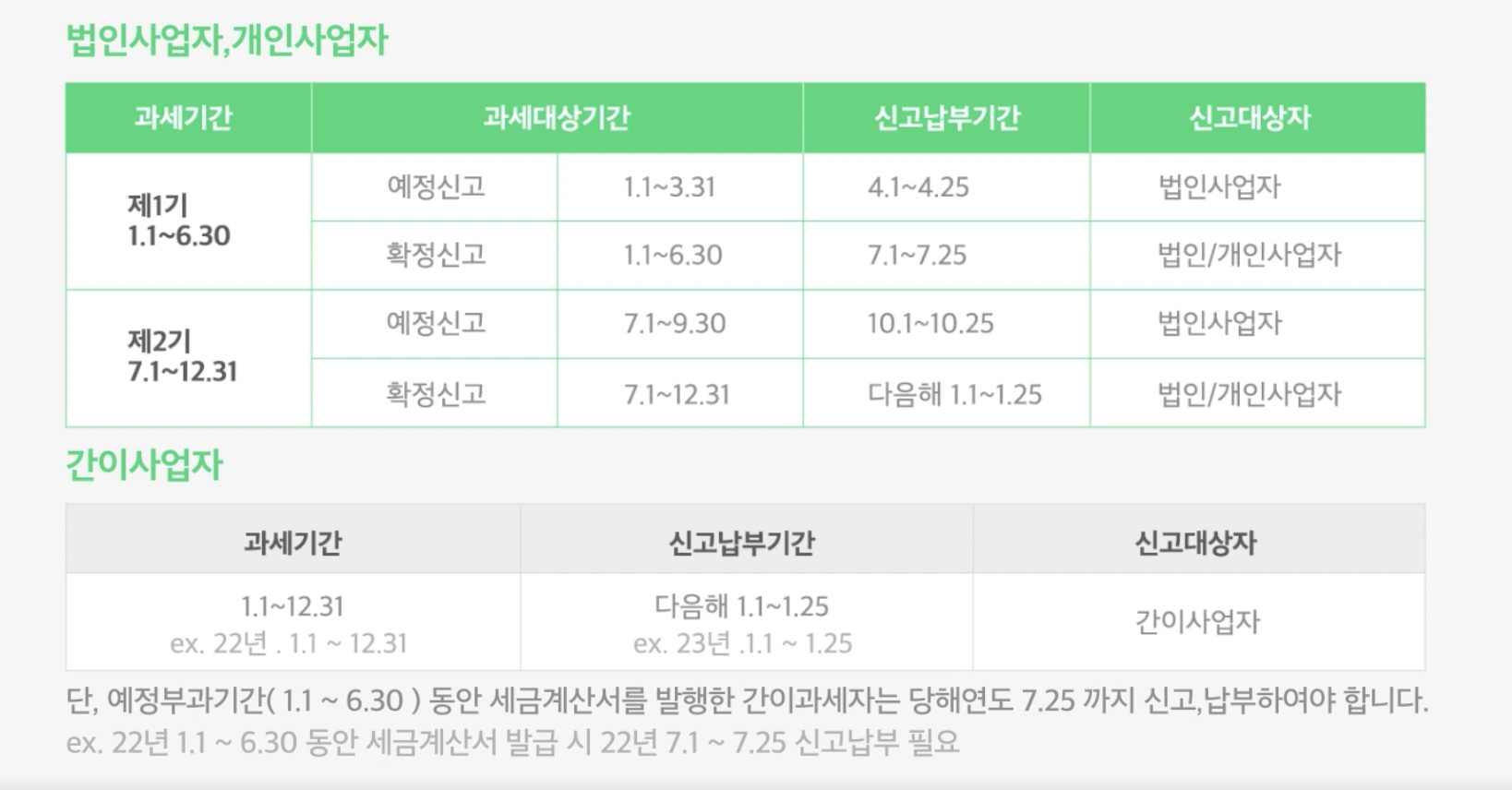 법인 사업자는 1년에 4회를 신고하며, 직전 과세기간 공급가액의 합계가 1억 5천만원 미만일 경우 직전과세기간(6개월) 납부세액의 50%를 4월, 10월에 예정고지서에 의해 납부하게 됩니다.