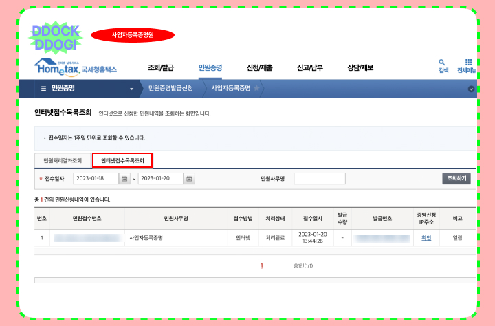 이렇게 나의 접수목록에 사업자등록증명원이 정상적으로 접수처리된 것을 확인할 수 있습니다.