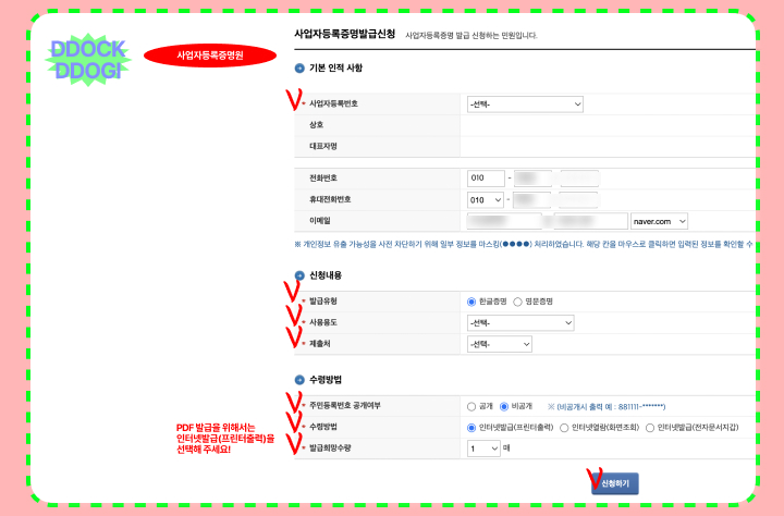 기본인적사항에서 사업자등록번호를 선택하면 아래의 상호와 번호, 이메일 등 자동으로 입력됩니다. 신청내용에는 어디에 어떻게 쓰이는지에 대한 간략한 절차라고 생각하시면 됩니다.