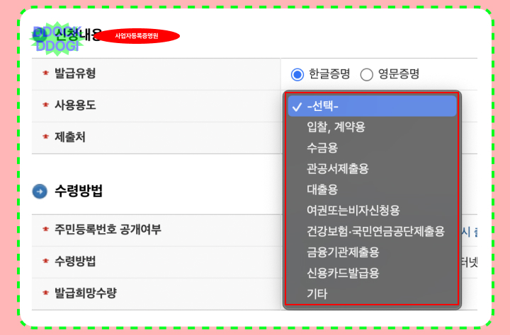 이런 식으로 사업자등록증명원을 어느 용도로 제출하는지 선택할 수 있습니다.