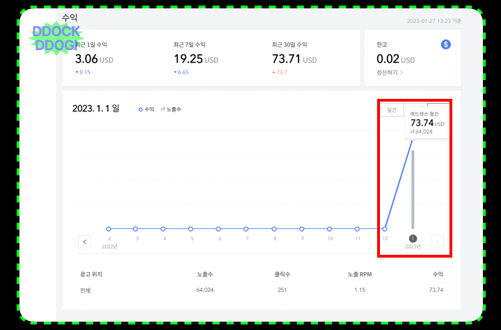 위의 이미지는 제가 서브 계정으로 테스트한 티스토리 결과값인데요. 22년 12월에 처음 시작해서 승인받는 데까지 14일, 정확히 2주가 소요되었고 승인 이후에는 원하는 다른 카테고리로 글을 작성해 수익 성장에 집중하고 있습니다.