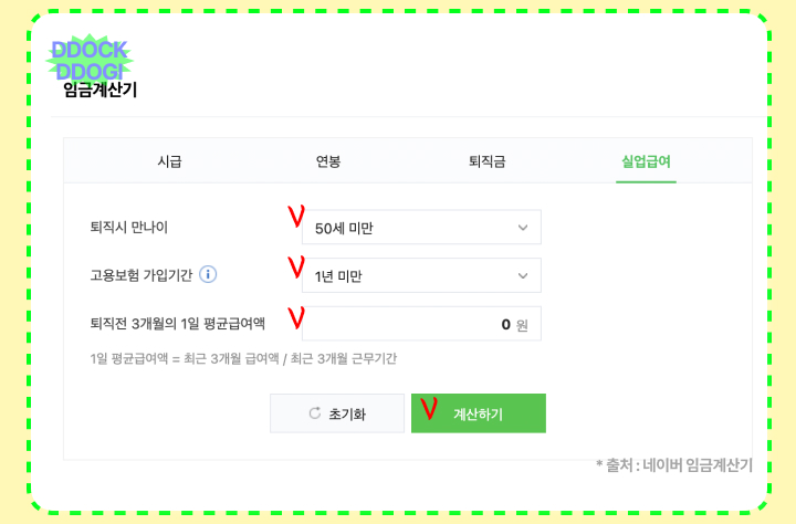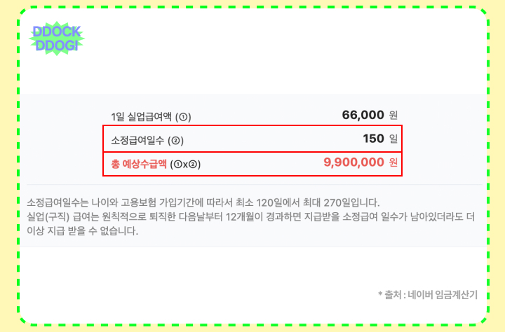 실업급여 모의계산 해보기 귀하의 구직급여일액(1일)은 원이고, 예상 지급일수(소정급여일수)는 일이며, 총 예상 지급액은은 원 (구직급여일액 x 예상 지급일수) 입니다. 계산하기 초기화 구직급
