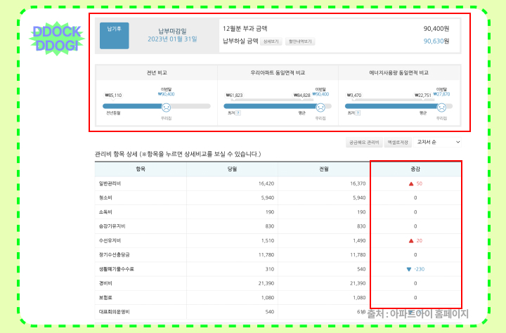 이렇게 납부 마감일과 동일 면적, 그리고 상세한 항목에 대한 증감 내역도 볼 수 있고 아주 상세하게 확인할 수 있어서 애용하고 있는 서비스입니다. 어플도 있으니 핸드폰으로도 확인이 가능합니다.