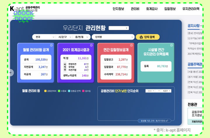 아파트의 전체 관리비를 조회할 수 있는 K-apt 공동주택관리 정보시스템은 로그인 없이 조회할 수 있어서 사이트만 들어가면 간편하게 확인할 수 있습니다. 사이트에 접속하면 가장 먼저 아래와 같은 화면이 보일 것입니다.