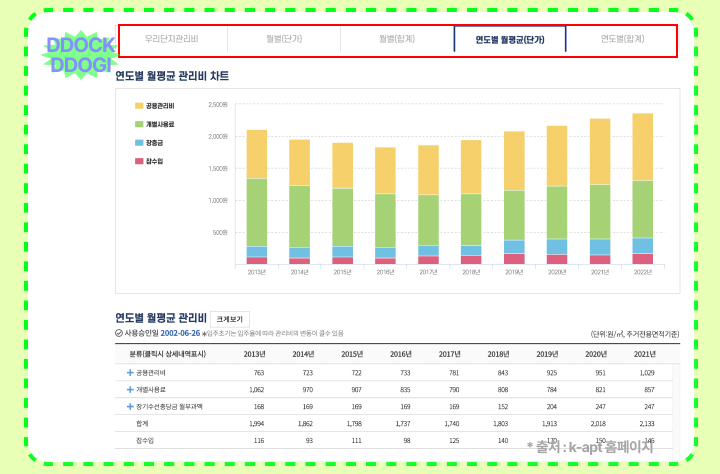 본인의 지역과 단지를 선택하면 관리비, 월별단가, 월별합계, 연도별 월평균, 연도별 합계 등 상세하게 확인할 수 있습니다. 옆의 단지와도 비교할 수도 있고 상세하게 다양한 항목을 조회할 수 있어 아주 편리합니다.