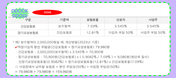 건강보험료에는 추가로 부담되는 '장기요양보험료'도 있는데 이 금액은 건강보험료에서 공제되는 금액입니다. 건강보험은 근로자와 사업자 3.545%와 장기요양보혐료 12.81%를 각 각 부담합니다.