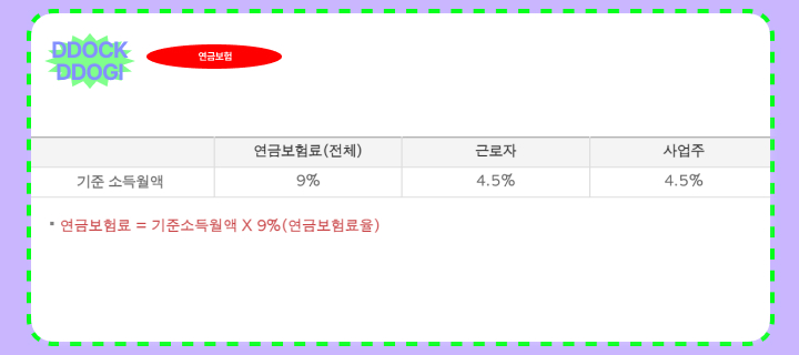 연금보험료는 소득액 x 9%를 납부해야 하며 근로자와 사업주 4.5% 나뉘어 납부합니다.