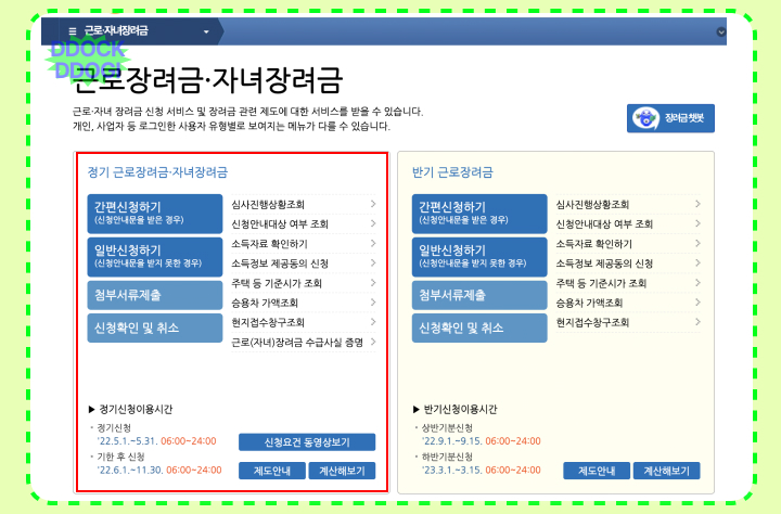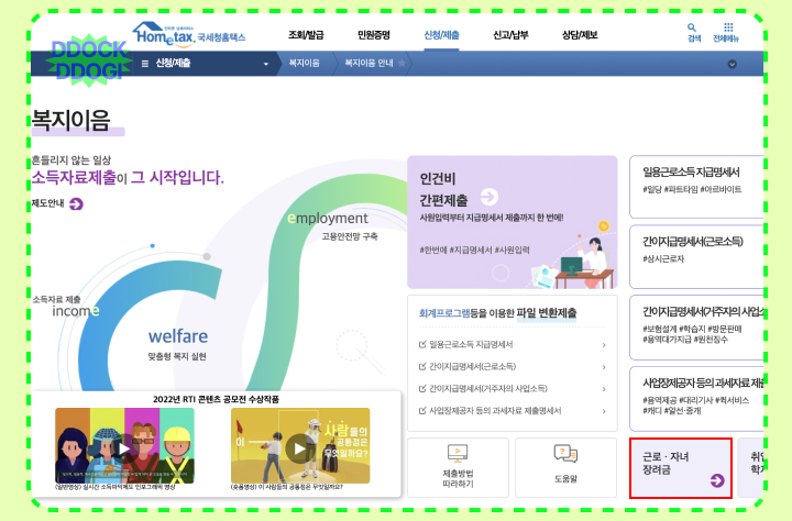 오른쪽 하단에 보이는 근로, 자녀 장려금을 클릭합니다.