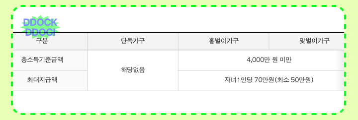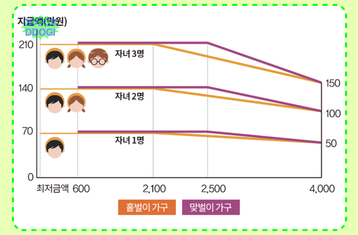 자녀장려금은 부부합산 총소득이 4,000만 원 미만이어야 하는데요. 사실 최저임금 연봉이 현재로 2,500 정도인데 맞벌이를 하고 있다면 해당되긴 아마 어려울 것 같습니다. 저소득이나 홑벌이 부부를 위한 혜택이라고 볼 수 있죠.