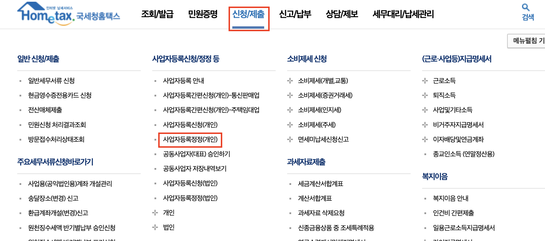 ► 온라인 신청 : 홈택스 > 신청/제출 > 사업자등록신청/정정 등 > 사업자등록신청(개인)