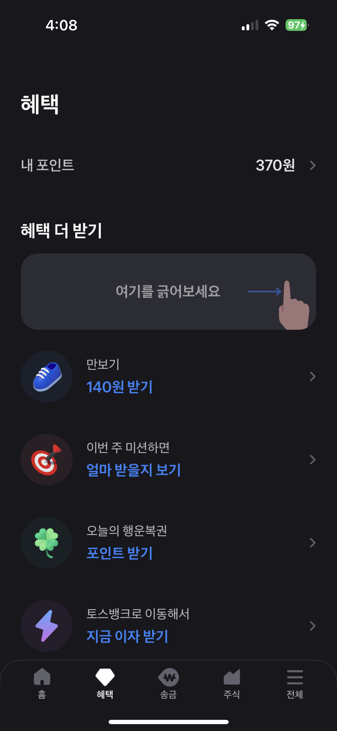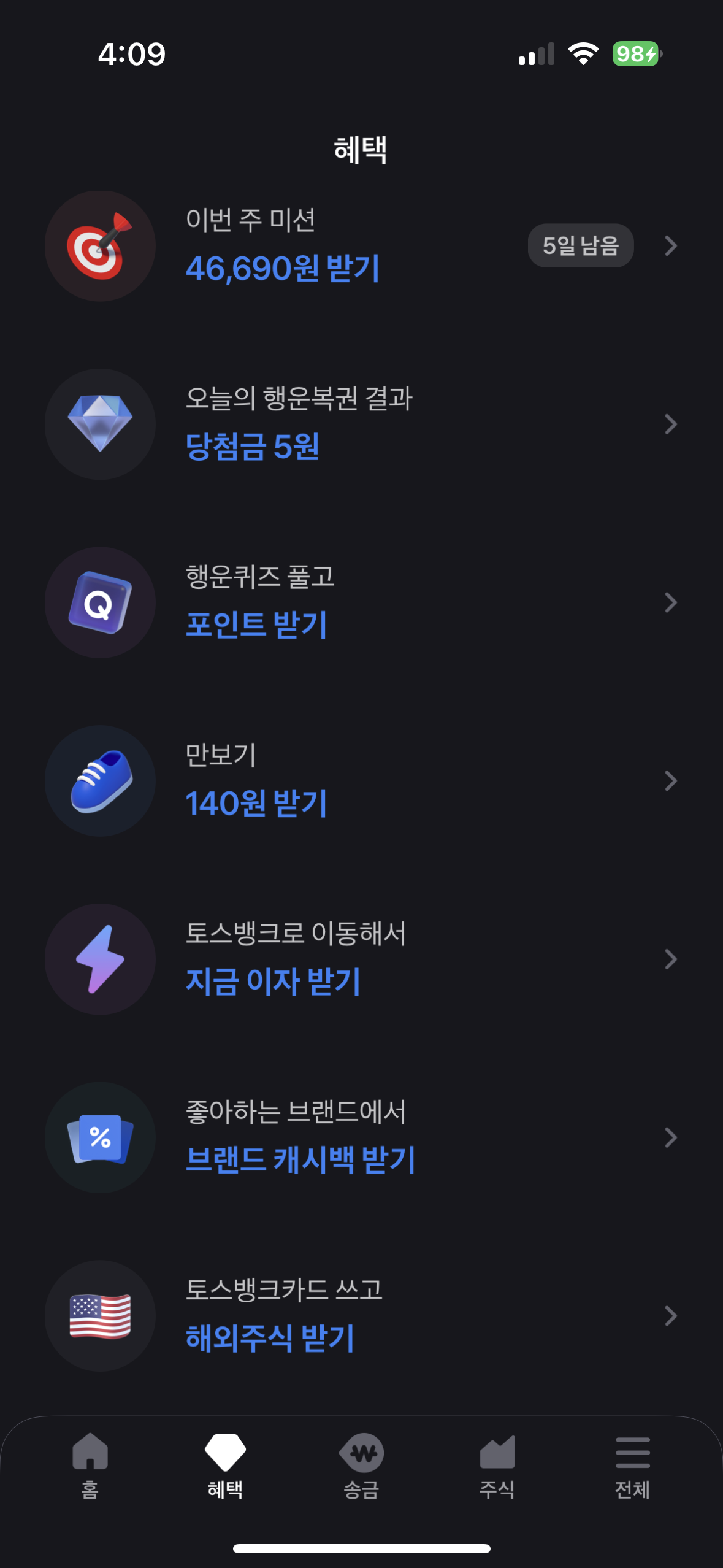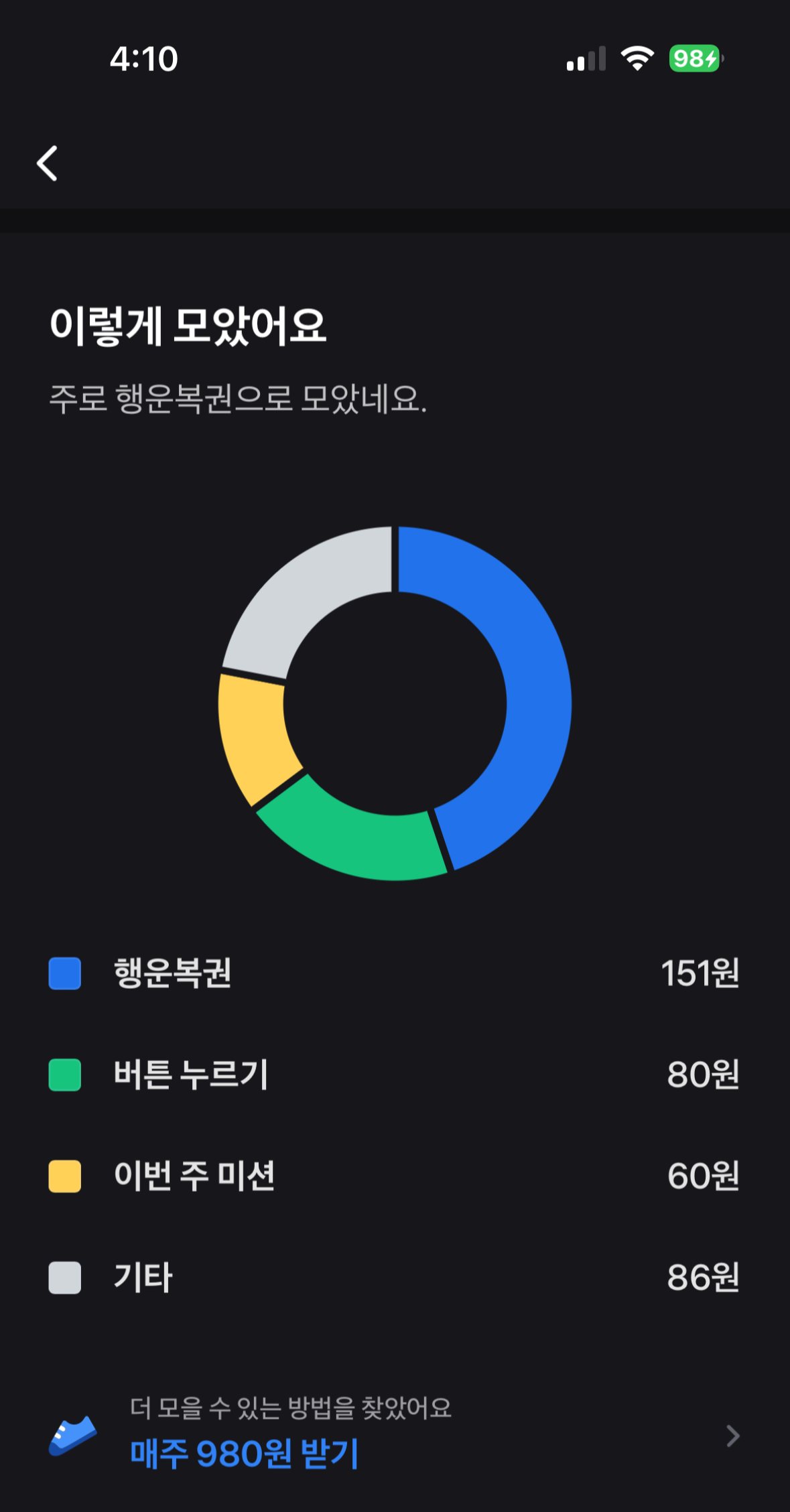 저는 주로 토스 행운복권, 페이지 방문, 행운 퀴즈,