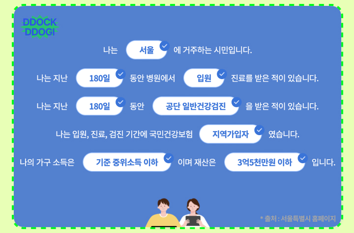- 서울시 거주 : (입원 및 입원연계 외래진료 또는 공단 일반건강검진) 발생 30일 전부터 주민등록 상 주소지가 서울.