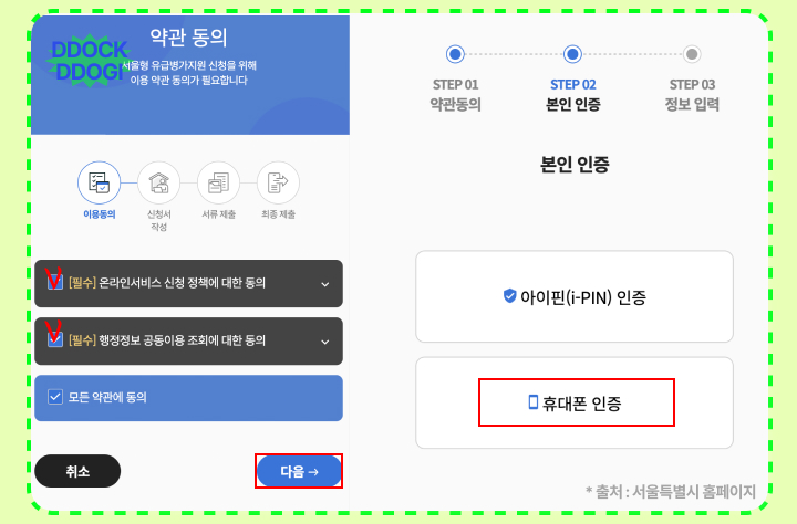 절차는 이용동의 > 신청서 작성 > 서류 제출 > 최종 제출 총 4단계로 이루어집니다.