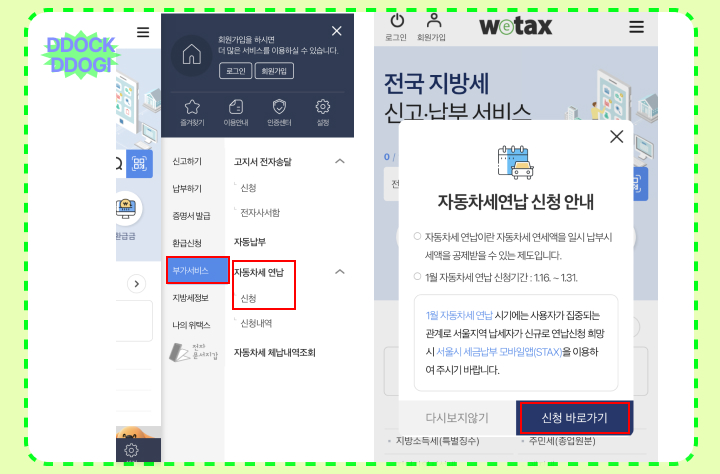 지방세를 납부할 수 있는 위택스 홈페이지 또는 어플로 접속하면 우측처럼 팝업 배너가 뜨는데 해당 신청으로 들어가도 되고, [메뉴탭에서 부가서비스 > 자동차세 연납 > 신청]을 클릭해도 됩니다.
