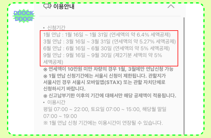 원래 자동차세는 1년간 6월 1기분, 12월 2기분으로 나뉘어 세금을 납부해야 하지만 미리 일괄 납부하는 경우 자동차세를 할인받을 수 있습니다. 1월에 미리 자동차세를 연납해 버리면 자동차세를 조금이라도 아낄 수 있으니 날짜에 맞춰 빠르게 연납하는 것을 추천합니다!