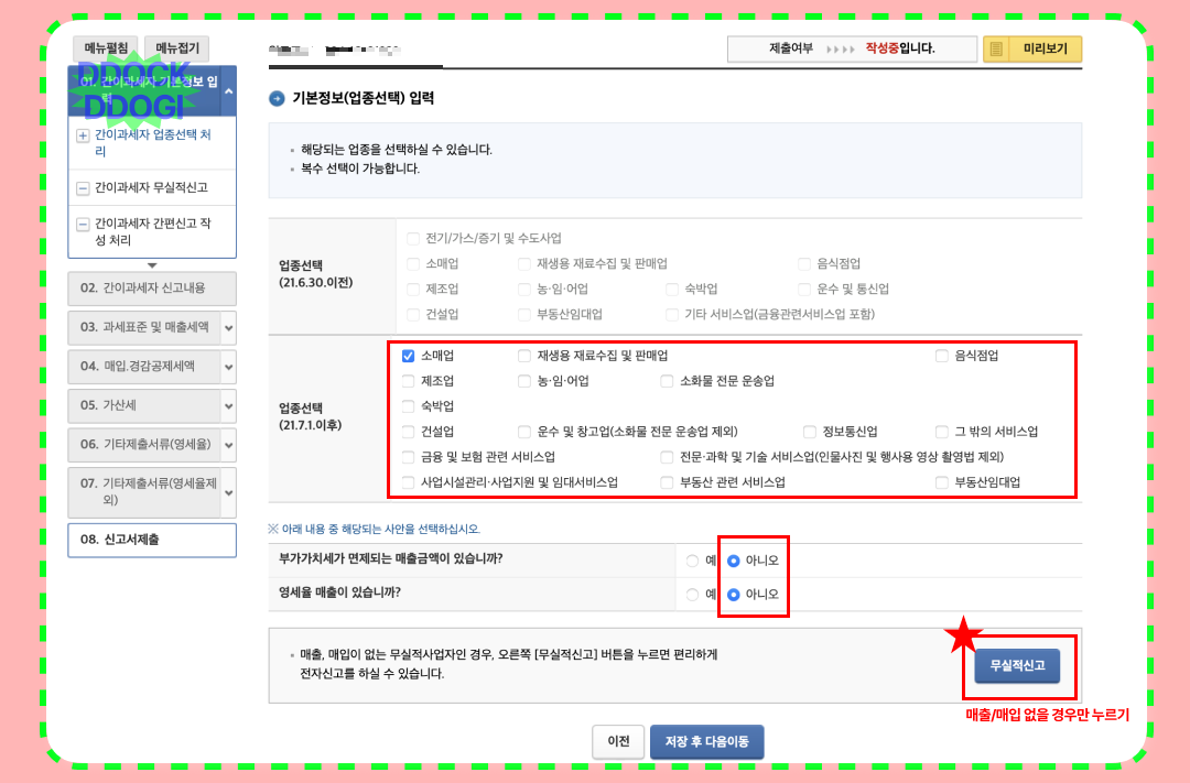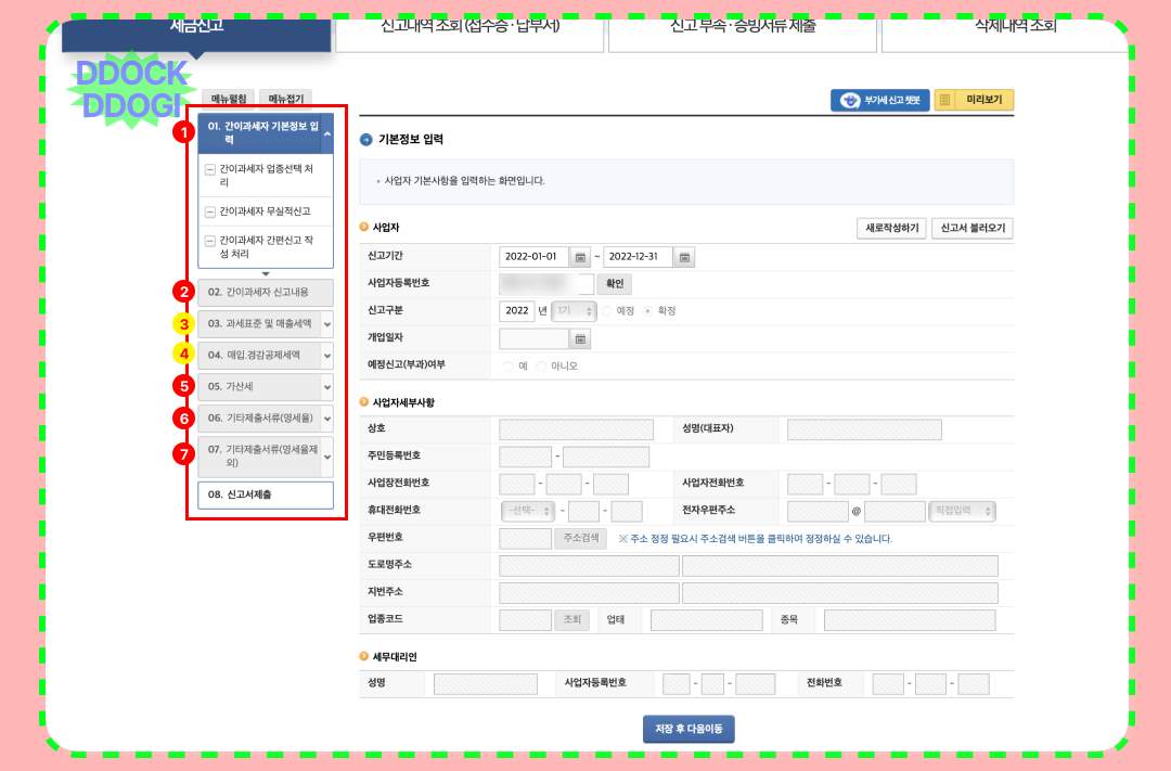 신고를 시작하면 위의 화면이 바로 보이실 텐데요. 1~7까지 해당 순번에 맞춰 진행이 될 거고, 3,4번이 가장 중요한 항목이라 색상을 다르게 표시했습니다. 처음 사업을 시작하는 것도 어려운데 홈택스에서 업무를 처리할라 하면 용어가 넘사벽이죠... 정말 어렵게 느껴질 것입니다. 그래서 그냥 똑또기의 자료 대로 차근차근 따라오시면 됩니다.
