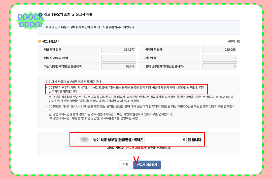 이렇게 모든 항목을 작성하셨다면 신고서 제출을 하면 되는데요. 우리는 간이과세자 부가가치세 신고를 하고 있기 때문에 4,800만 원 미만인 간이과세자는 납부의무를 면제한다고 하죠? 이러나저러나 세액은 0원이 뜰 것입니다.