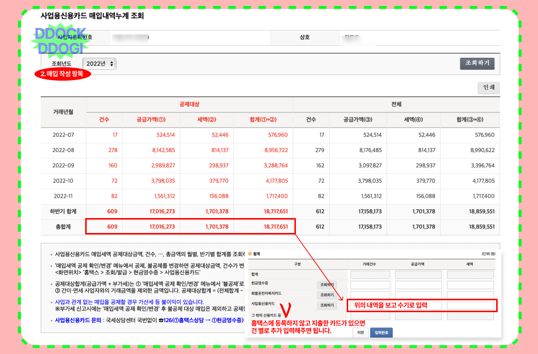 여기서 주의해야 할 점이 있습니다. 사업자카드가 홈택스에 등록되어있지 않다면 건 별로 입력해야 하는 불상사가 있고... 사업자카드가 등록되어 있다면 해당 사업자 카드 정보를 쭉 불러오는데 혹시라도 사업 외 사적으로 지출하신 내역이 있다면,, 그것도 복잡해지는데요.