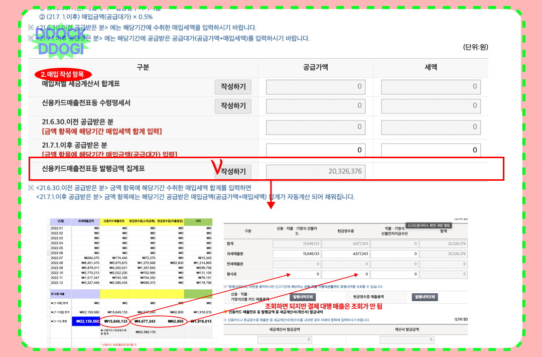 신용카드와 현금영수증까지 작성하셨다면 이제 매입 작성 항목 맨 아래의 또 비슷한 이름의 ► 신용카드 매출전표 등 발행금액 집계표가 보이죠..? 매입 작성 항목이지만 갑작스럽게 매출금액을 적어주는 겁니다. 어렵다 어려워;;