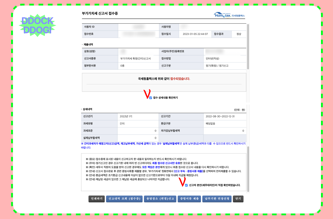 확인 후 제출해 주시면 잘 접수되었는지 접수증을 확인할 수 있습니다. 이렇게 하면 2023년 1월 간이과세자 부가가치세 신고가 끝! 어렵지만.. 또 간단하기도 하죠...? 어차피 세액 0원이니까 대충 작성하면 되는 거 아냐!? 라고 생각하실 수 있지만.. 저희에겐 곧 다가올 5월 종합소득세 신고날이 있잖아요. 지금 잘 작성해야 종소세 때 제출할 장부와도 잘 맞출 수 있으니 그냥 미리미리 꼼꼼하게 작성하실 것을 추천합니다.