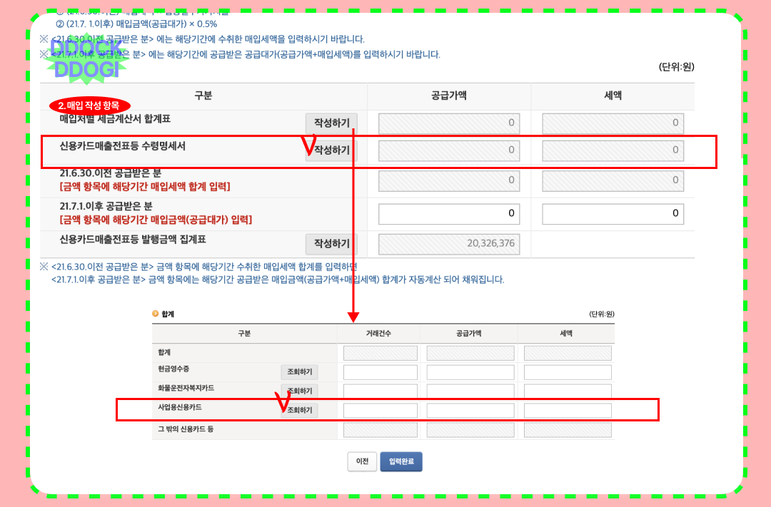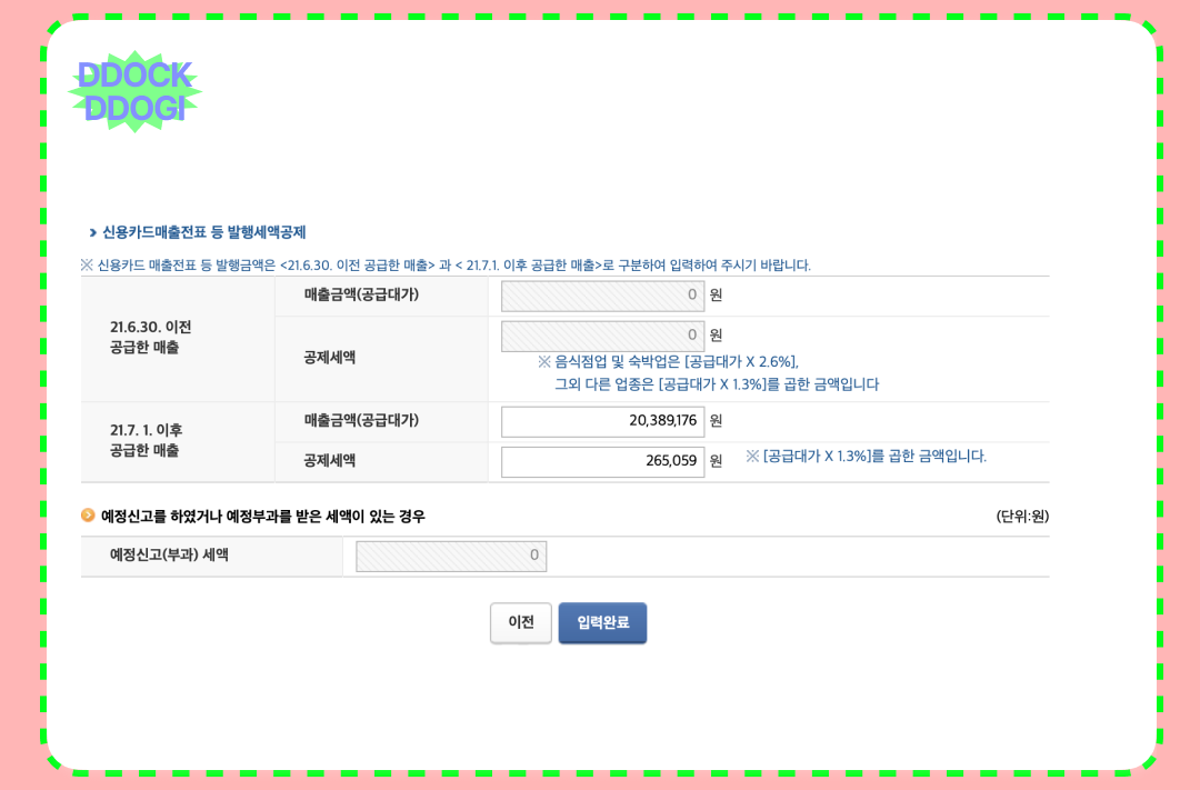 간이과세자 부가가치세 신고방법을 준비했습니다. 이전 글에서는 신고 기간이 아니라 부족했던 부분을 부가세 신고 기간이 된 지금! 실시간으로 준비해 보았습니다.