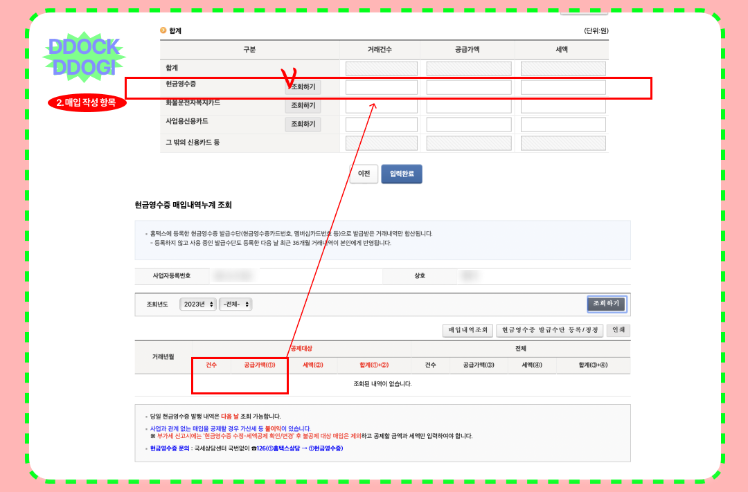 신용카드 부분 입력이 끝났으면, ► 현금영수증 탭을 조회해 주는데요. 이것 또한 바로 조회가 가능하니 하단의 현금영수증 매입내역누계 조회한 건수와 공급가액 세액을 수기로 기록해 줍니다. (수동으로 입력하는 거 살짝 열받아요^^)