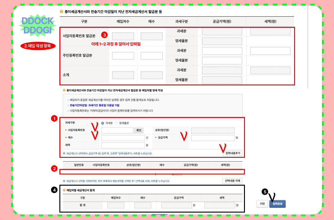혹시라도 전자세금계산서 외에 종이세금계산서가 있으시다면 별도로 입력해 주셔야 하는데요. 위의 그림처럼 1번을 수기로 작성하고, 2번에 작성한 내용을 확인하면 3번에 자동으로 입력이 됩니다. 4번에도 반영된 것이 보이는데 맞는지 꼼꼼하게 확인 후 입력완료를 눌러주세요.